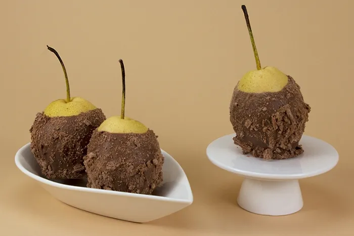 4 Pears Hand Dipped in Belgian Milk Chocolate coated in Cadbury Milk Flakes | |