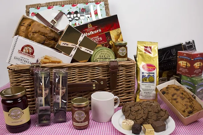 The contents of this hamper include; Walkers Biscuits for Cheese, Bradfords Tomato Chutney, Bradfords Luxury Shortbread, Arran Cheese with Herbs, Bradfords Granny's Best Pickle, Belgian Chocolates, English Afternoon Tea, Choc-o-lait Belgian Drinking Chocolate Sticks, Freshly Ground Coffee, Farmhouse Sultana Cake, Double Chocolate Biscuits, English Beakfast Tea, Fruit Ginger Cake, Whitakers Mint Selection and Raspberry Jam.