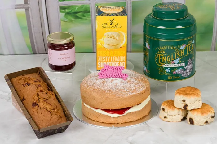Inside each box the Birthday boy or girl will find their cake, which can be personalised if requireed, a large stylish tin of 80 Tea Bags, a loaf cake for slicing, Lemon Shortbread, Scones and Jam. A candle is included.