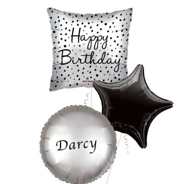 Pillow shaped Happy Birthday balloon in a striking silver and black design that really catches your eye and would be suitable for men or women. As a single balloon it would make the perfect gift but when sent as a bunch of 3 or more with contrasting black balloons this is a fabulous centrepiece. Free gift options are available with your bunches of 3 or more and arrive neatly packaged in the one box.