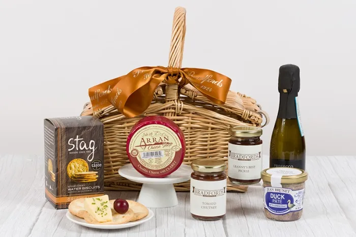 This cute little shopper basket is filled with tempting treats selected for the savoury palate. Each basket includes a small bottle of Prosecco, pickle and chutney, crackers and cheese and every order also includes a free gift card.