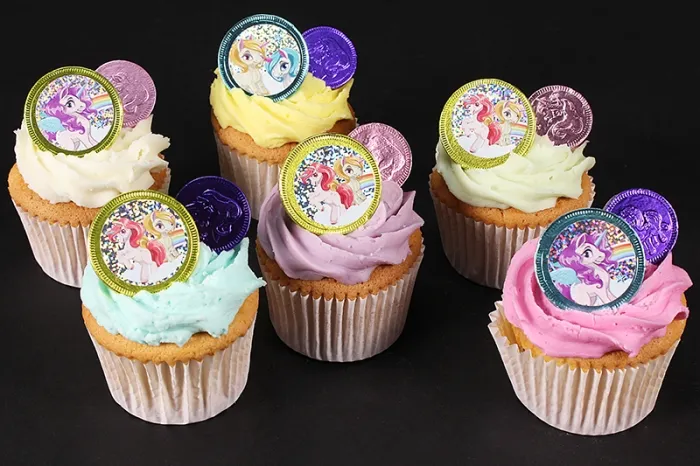 Indulge in the taste of nostalgia with our scrumptious Chocolate Coin Cupcakes. Each freshly baked cake is made from light Madeira sponge decorated with generous layers of flavoured frosting. A tasty chocolate coin is then delicately placed on top by hand.