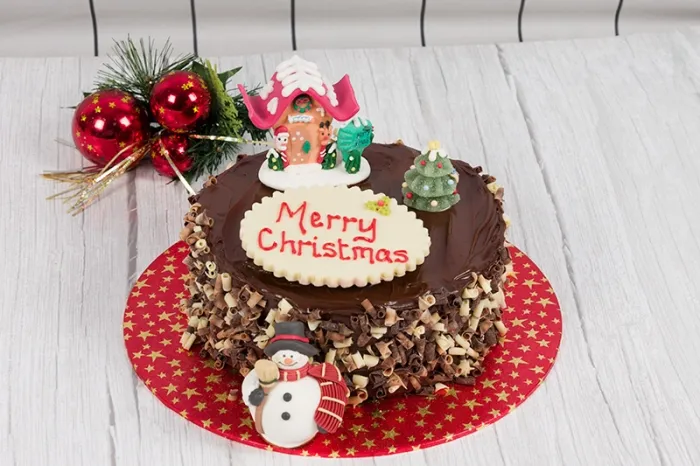 Our best selling Cheeky Chocolate Fudge Cake is made from rich chocolate sponge with lashings of thick chocolate frosting and is now available with the inclusion of Royal Icing and Jelly Christmas Decorations. Each cake is then finished with a personalised Merry Christmas message on a white chocolate plaque. Serving between 8 and 12 people this makes a great Christmas cake.