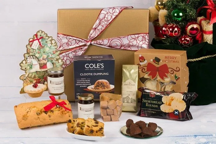 Every order includes: Bradfords Brandy Mincemeat Pies, Farmhouse Sultana Cake, Stewarts Shortbread Rounds and Clootie Dumpling dessert as well as a selection of our handmade Belgian Chocolate Salted Caramel Truffles. For added value we include a jar of both our Fine Cut Orange Marmalade and Strawberry Jam, a satchel of Vanilla Fudge and a packet of Medium Roast Columbian Coffee. Every order also includes a free gift card for your personal message.