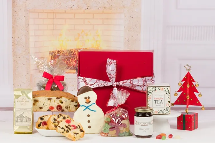 Presented in a festive gift box with printed ribbon, every order includes Bradfords traditional Sultana Cake, a bag of Dry Roasted Coffee, an Individual Brandy Pudding, a jar of Strawberry Jam, A Christmas Bag of Sweets, English Breakfast Tea and a Handmade Snowman Biscuit. A free gift card lets you add your personal seasonal message.