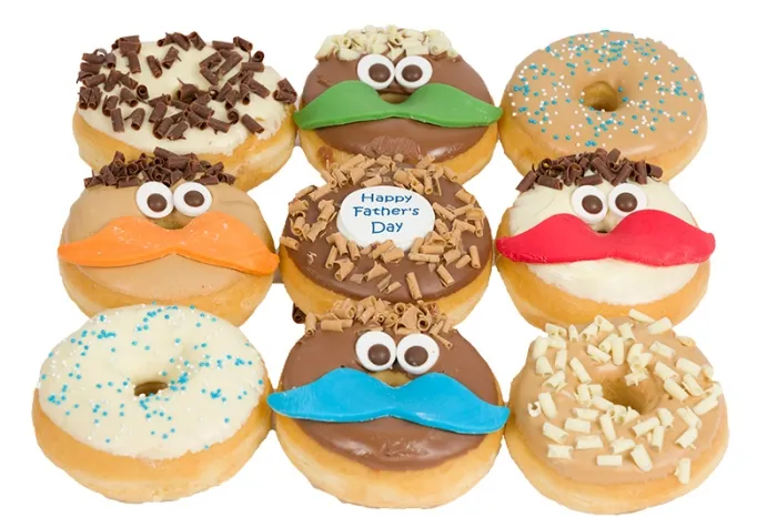 Do-nut forget about Dad this Father's Day! Send him something special with our Dapper Dad Donuts. Each of our freshly baked ring donuts are dipped in white, milk or blonde chocolate and then decorated with Dapper Dad Faces including coloured moustache. Each donut is decorated with Chocolate Curls or finished with white and blue hundreds and thousands. An edible message is printed on an edible sugar disc on the centre donut to complete the gift for your dad's special day.
