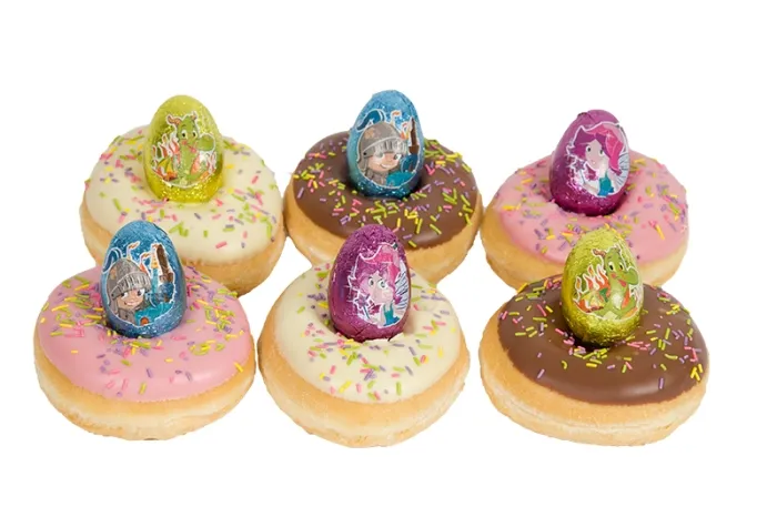 A colourful array of delightful donuts. Enjoy our mix of our chocolate dipped Doughnuts, each one topped with a sprinkle of vibrant edible confetti and a foil covered hollow milk chocolate egg. Foil decorations include a mix of dinosaur, prince and princess designs.