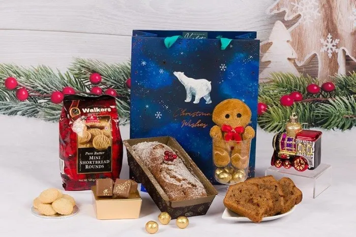 Some of the best gifts come in little packages and this is no exception. Presented in a festive gift bag, you will find a fruity spiced Apple & Cinammon cake, a box of 4 chocolates, shortbread and a bag of milk chocolate balls with a soft gingerbread man decoration.