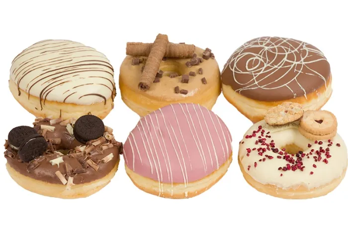 A scrumptious variety of 3 chocolate dipped Ring Doughnuts, each one topped with a variety of cute mini biscuits and Chocolate dipped filled Doughnuts. Flavours of Ring Doughnuts may include Milk chocolate topped with Mini Cookies, Blonde chocolate with Mini Gingerbread Men, Milk Chocolate with Mini Oreo and fudge brownie pieces, White chocolate with Lotus Biscuits and Cookies and Blonde Chocolate with Cappuccino Wafers. Flavours of Filled Donuts include, Apple & Cinnamon with real fruit chunks, a Berry Fruit filling with real fruit pieces and a Soft Toffee filling for a totally tempting treat!