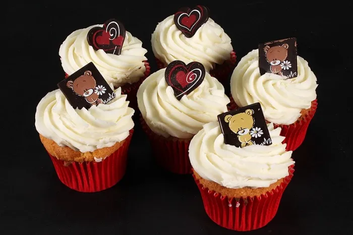 Chocolate Teddy Plaques and Heart decorations top these Madeira cupcakes. Each cake is topped with a swirl of Vanilla frosting before the decorations are placed carefully on top.
