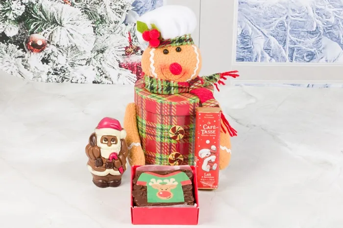 A delightful Christmas gift box with plush gingerbread man decoration. Filled with a milk chocolate Cafe Tasse chocolate bar, a hollow milk chocolate Santa and a freshly baked chocolate brownie with jumper decoration.