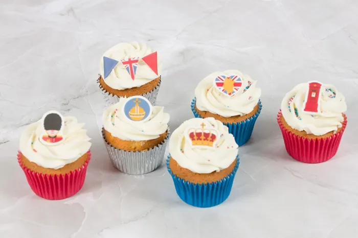 Celebrate the best of British with our selection of Vanilla and/or Chocolate Cupcakes. Each cupcake is baked in red, white or blue cupcake cases and decorated with a generous swirl of vanilla or chocolate frosting before being decorated with edible decorations, synonomous with British traditions. Sprinkles of red, white and blue are used to complete the theme.