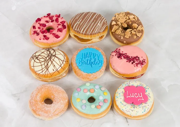A scrumptious variety of ring donuts and filled donuts with a Birthday theme, each one topped with a variety of flavoursome toppings, including meringue pieces, raspberry crumble, biscuit and chocolate pieces. Flavours of Filled Donuts include soft toffee, jam and a blonde chocolate filling for a totally tempting treat! Along with the stamped Happy Birthday message, Donuts are then personalised with the recipients name and age if required