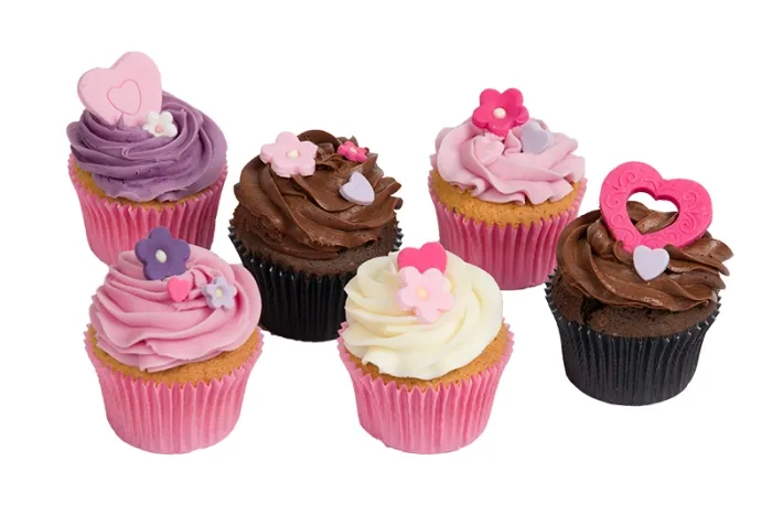 These delicate and flavoursome cupcakes are a real work of art – featuring luscious helpings of edible hearts and flowers. Made from a mix of fluffy Madeira and rich chocolate sponge, each fresh cupcake is crowned with a generous layer of frosting in flavours like blueberry, chocolate and vanilla before the edible toppings are added by hand.