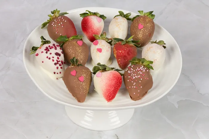 These stunning Hand-Dipped Chocolate Strawberries are the perfect gift for the one you love. Each Fresh Strawberry is dipped in Milk or White Belgian Chocolate before a selection of luxurious toppings are applied to provide an eye catching display upon opening, and they taste just as good as they look. Great for sharing, but only if you want to!