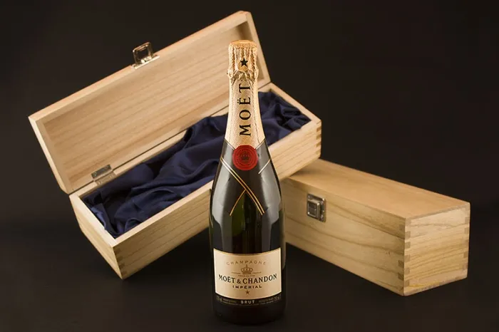 Every 75cl bottle of Moet and Chandon Brut Imperial (12% ABV) we deliver is presented in a hand crafted presentation box made with wood and lined with silk. A free gift card is also included.