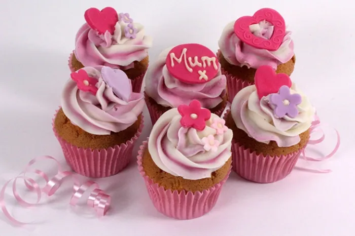 Vanilla sponge cupcakes hand decorated with a fusion of strawberry and vanilla frosting blended together to create a ripple effect frosted design that tastes amazing too. A striking cerise pink disc is hand written in white chocolate for Mum, while a selection of hand cut hearts and flowers are used to decorate the remaining cupcakes The perfect gift for mum.