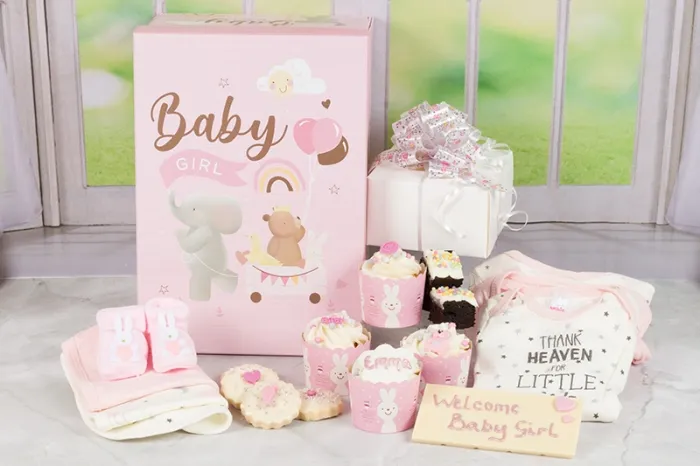 Packed carefully in the box for baby are 3 Babygrows (age 6-9 months), 3 Pairs of Socks, 1 pair of Bootees and 3 Bibs, while treats for the family include decorated Shortbread Biscuits, Chewy Fudge Brownies topped with a white chocolate frosting and 4 Vanilla Sponge Cupcakes with New Baby Decorations including the New Baby's Name (if required). These gifts will be sent out in either a pink or blue colour scheme, suitable for a baby girl or boy. Additional items if ordered will be included inside the box before being tied with a decorative ribbon.