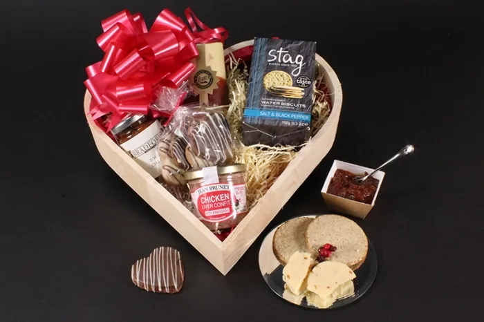 Enjoy a variety of Savoury treats presented in a re-usable wooden, heart shaped tray. Each tray contains a selection of Bradfords own Chutney, Pickle and chocolate Shortbread hearts, together with Pate, Carmelised Onion Chese and Stag Water Biscuits.
