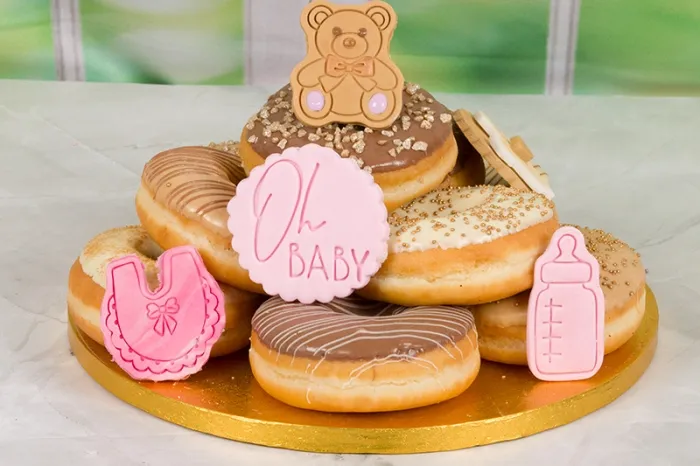 This is the perfect Baby Shower centrepiece or treat for the family to celebrate the new arrival and share with visiting family or friends. Each stack contains 9 donuts and a selection of handmade edible decorations in your choice of colour. Mini Chocolate bars and meringues are positioned within the tower of donuts. Each stack comes wrapped in cellophane and presented with a fabulous bow to finish.