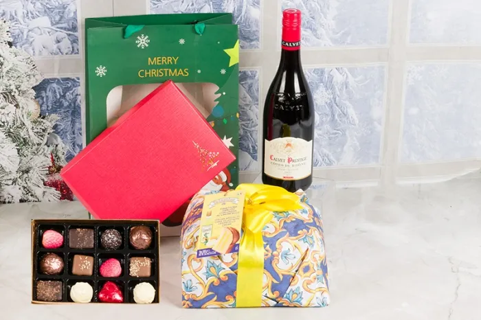 A delightful traditional Christmas gift containing a large 2lb Limoncello Panettone, beautifully wrapped with paper and bow, together with our popular Belgian Chocolate selection and your choice of Red, White or Rose Wine