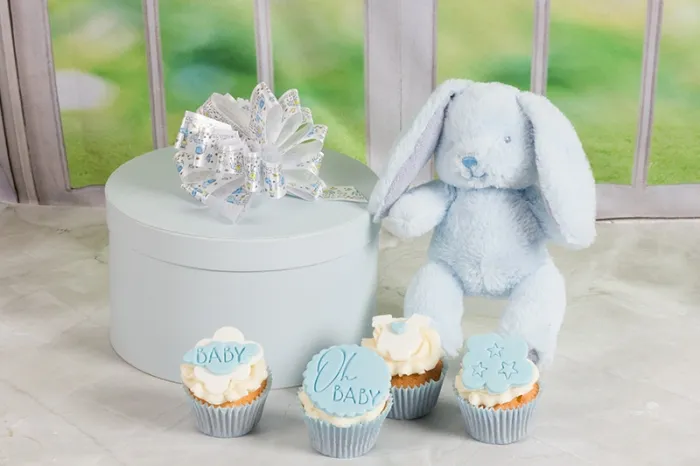 A delightful keepsake gift box to send in celebration of the new arrival.  Your gift box will arrive personalised with baby's name, if required, and contains a supersoft plush Rabbit for baby and a box of 4 freshly baked vanilla cupcakes with assorted decorations for a thoughtful gift.