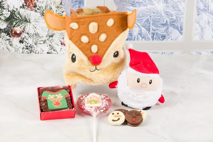 A cute, plush reindeer gift bag filled with Christmas chocolate brownie, fruity Christmas lolly, a soft Christmas toy and 4 chocolate assorted macarons. The perfect stocking filler.