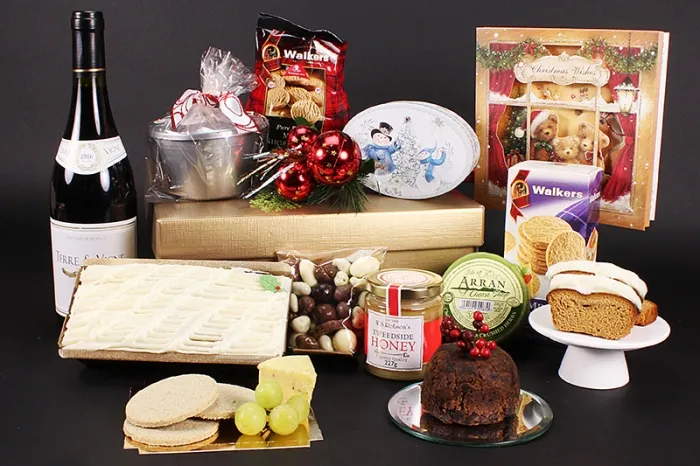 Delivered in a pretty gold box with festive gift bow every box contains a bottle of red, white or rose wine, a Coles Traditional Christmas Pudding, a truckle of Arran Cheddar Cheese with Herbs, a jar of Tweedside Blossom Honey, Bradfords Iced Ginger Cake, Shortbread Shapes and Cocktail Oatcakes, a satchel of Chocolate Fruit & Nut Selection and a cute Keepsake Box filled with Milk Chocolate novelties. You can also add a personal message with our free gift card.