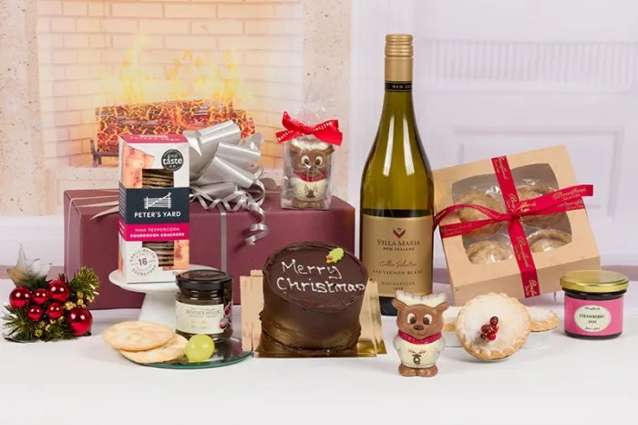 This cute Festive Gift includes your Choice of Red, White or Rose Wine, Wooden Spoon Red Onion Marmalade, 4 Bradfords Luxury Mincemeat Pies, Bradfords Strawberry Jam, A Chocolate Fudge Cake with Merry Christmas Decoration, and an adorable Milk Chocolate Reindeer. All of these items are then packed into a Luxury Christmas Gift Box with a Traditional Santa design.