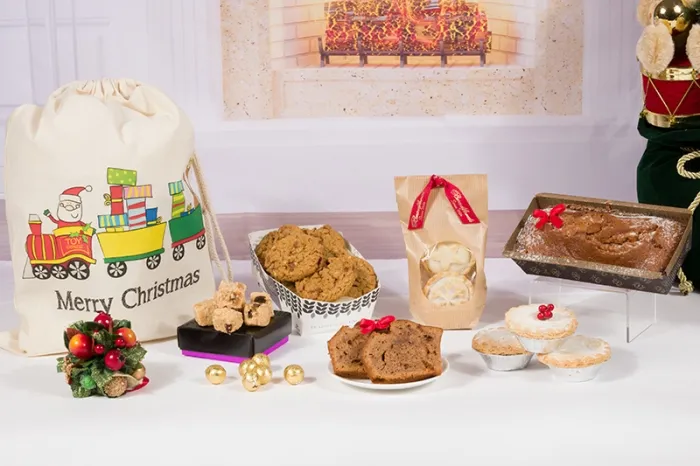 Santas Treat Bag is a quirky and unusual Christmas Gift which includes a bag of 3 Luxury Bradfords Mincemeat Pies, a tray of Butterscotch Toffee Biscuits, a bag of Crumbly Mince Pie Fudge, a Bradfords delicousl Apple and Cinnamon Loaf Cake and Christmas Milk Chocolate Baubles wrapped in foil. These items are sent in a Canvas Gift Bag with a Bright Printed Christmas Design.