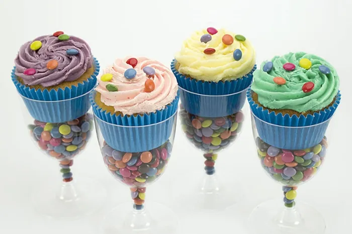 Colourful, cool and delicious our Smarties Cocktails are simply sweet heaven. Our unique cocktails are made from fluffy Madeira sponge cupcakes with generous layers of flavoured frosting and a 12cm tall plastic cocktail glass filled with smarties.