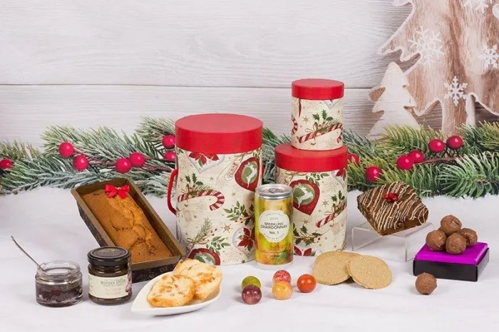 A decadent gift for one, this Sparkling Indulgent Christmas Tower contains a Champagne Truffles, Lemon Cake, a can of sparkling Chardonnay, Rich Fruit Cake, Oatcakes, red Onion Marmalade and Marzipan Fruits. All of these items are packaged neatly into a set of 3 Cylindrical Gift Boxes with a Quality Christmas Print.