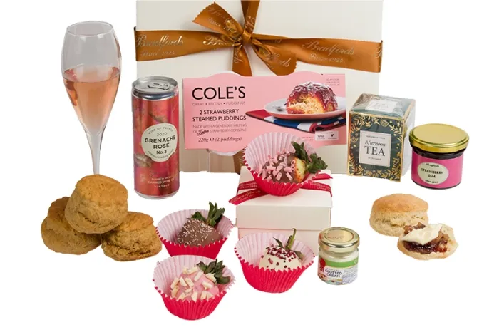 Each box contains 4 of our best selling Belgian chocolate dipped strawberries, award winning Canned Wine in the flavour of your choice, Coles Strawberry Puddings, Tea, Jam, Clotted Cream, and Bradfords own Treacle and Fruit Scone selection.