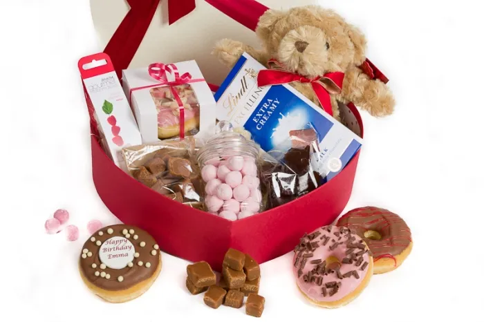 A selection of scrumptious sweet treats and keepsake Teddy presented in a luxury heart shaped gift box with satin red bow. This is a gift that is sure to impress the lucky recipient. Each box contains a Teddy Bear (25cm) and a selection of Chocolate Dipped Donuts with Personalised Message, Raspberry Marshmallows, Lindt Milk Chocolate Bar, Chewy Chocolate Fudge Brownies, Crumbly Fudge Squares and a jar of Strawberry Bon Bons